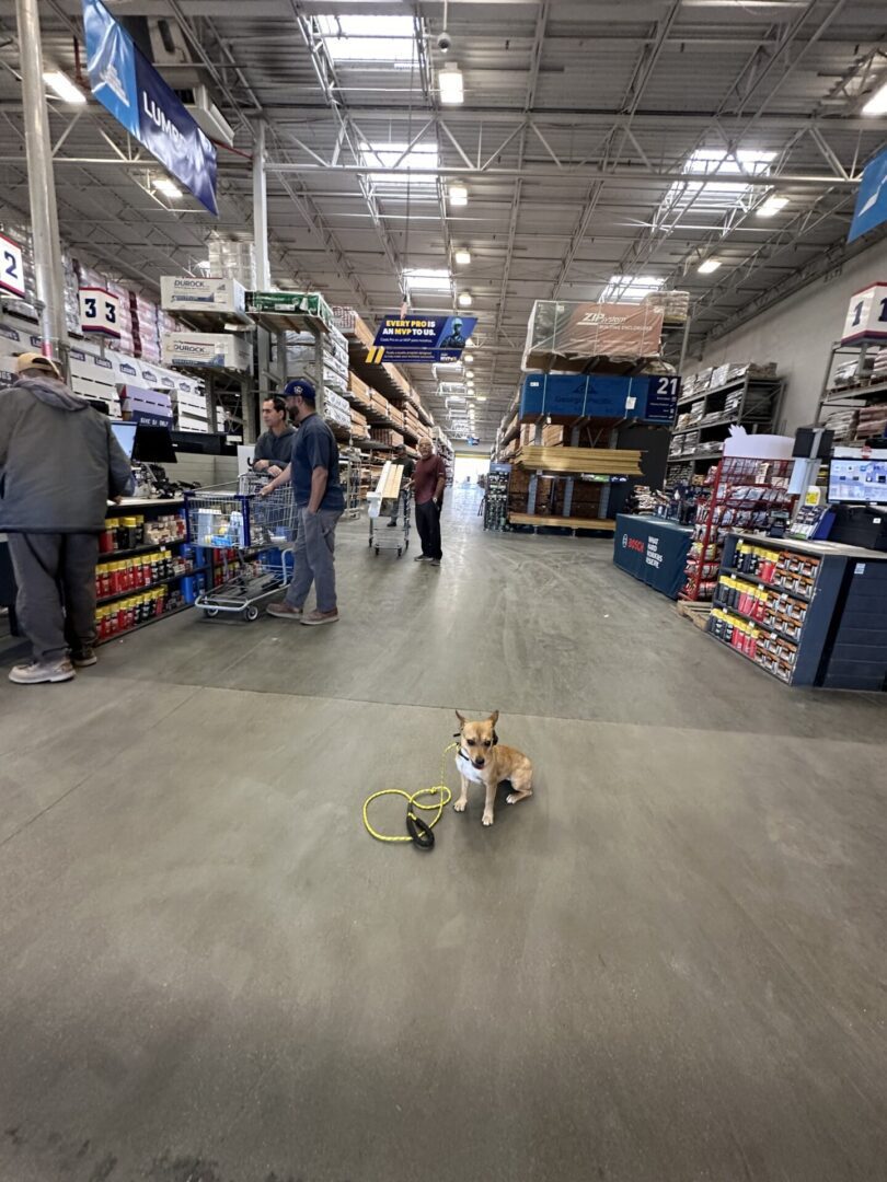 Today, we trained at Lowe’s to further expose Bella to human distractions and help her build confidence in busier environments. Although she’s generally comfortable around people, Bella can be a bit skittish with sudden, loud noises like forklifts or the rattling sounds in the lumber area. Aside from these noisy distractions, she does very well around other humans, showing steady progress in adapting to the activity around her.