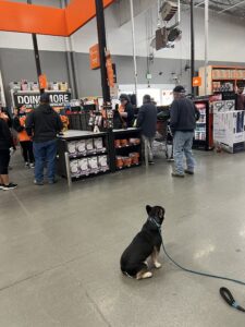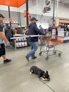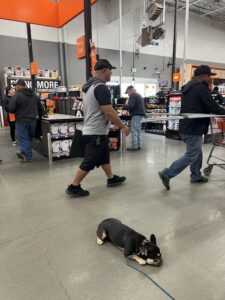 Here is Ferdi the French Bulldog holding his commands at a Home Depot store, amidst various distractions.