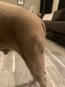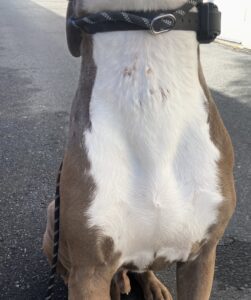 Today we focused on just completing our basic commands around our neighborhood. Franks attitude has shifted into becoming more positive and he is starting to enjoy coming out to train with us. His health seems to be getting better although he has recently developed a small elbow hygroma, which is a non painful, fluid filled swelling; as a consequence from sleeping on his right elbow. I am providing supportive care for Frank as we complete his board and train program and have provided him with softer bedding in his kennel in order to help his elbow. Other than that, he has only been showing progress and will continue to grow while he is with us.