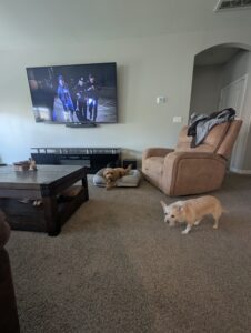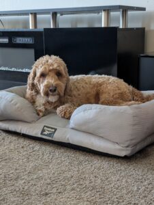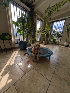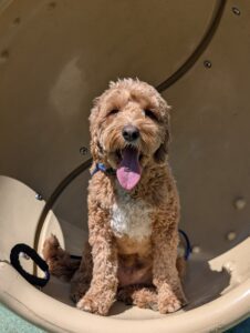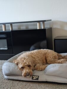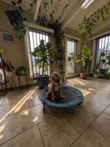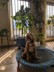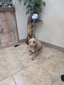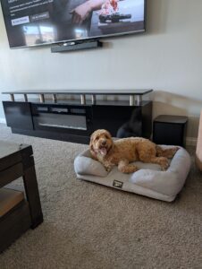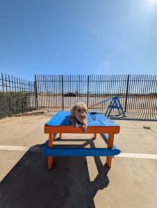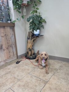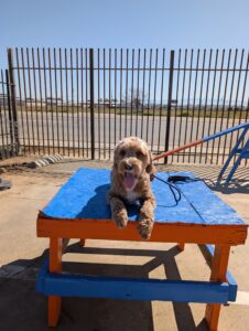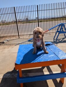 TRAINING HIGHLIGHTS: After a fun-filled day of training, Frankie earned some well-deserved relaxation time! He proved his skills by calmly relaxing on his place command, even with a dog distraction nearby! Frankie’s hard work and focus are paying off, and he’s learning to unwind in style!