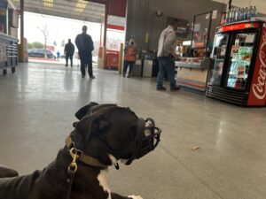 Today George has proven to us that he has made major progress with his training. For our sessions today we focused greatly on building confidence and reliable obedience at the gas station, around large distractions such as cars and civilians. Please stay tuned to watch George work his way into becoming a more docile and well mannered dog!
