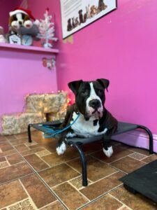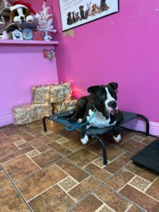 For todays training we focused mainly on keeping George the place cot while in the grooming salon while various distractions came by. George did an amazing job by not responding towards any triggers while laying down on the place cot. We are very proud of this progress and excited to see just how much George can learn by the end of our board and train program!