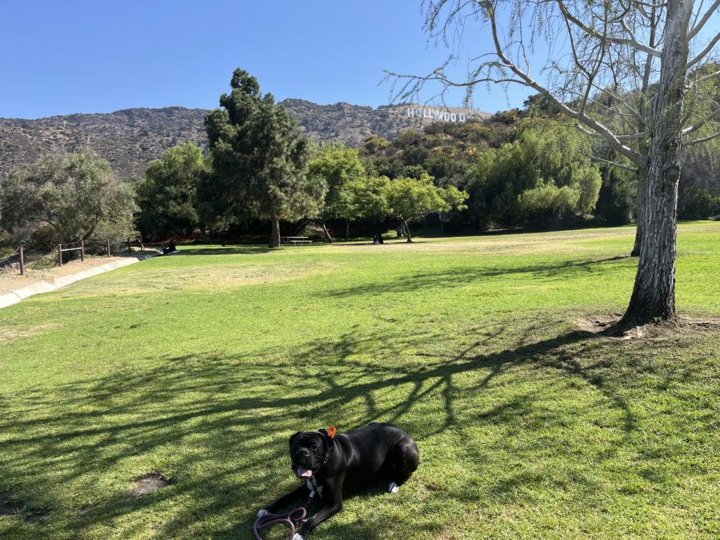 • Training Summary: Angus and Murphy are living the Hollywood life! Today we went to go visit the Hollywood sign. We were able to walk around the park with each of them individually while other people played with their dogs in the distance. Murphy and Angus were engaged in the training. Later we got home and we were able to practice off leash heel in my yard.
