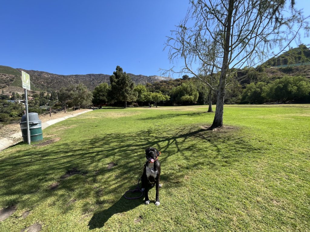• Training Summary: Angus and Murphy are living the Hollywood life! Today we went to go visit the Hollywood sign. We were able to walk around the park with each of them individually while other people played with their dogs in the distance. Murphy and Angus were engaged in the training. Later we got home and we were able to practice off leash heel in my yard.