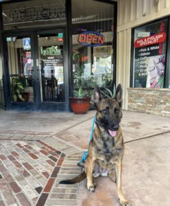 Poco did a great job as we were practicing our commands in front of the grooming salon. She is getting great at staying focused while near distractions and holding extended commands.
