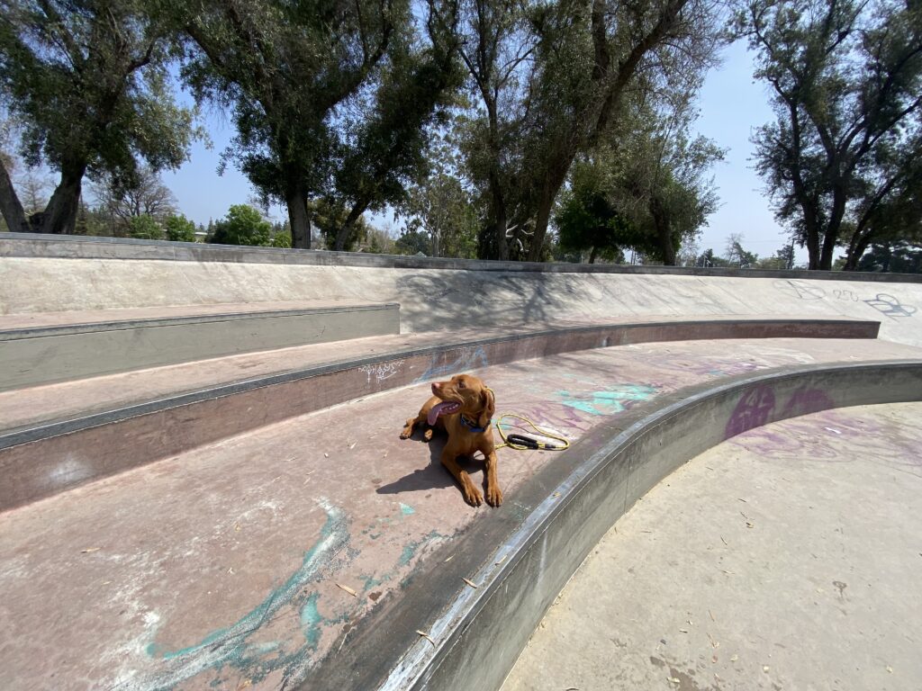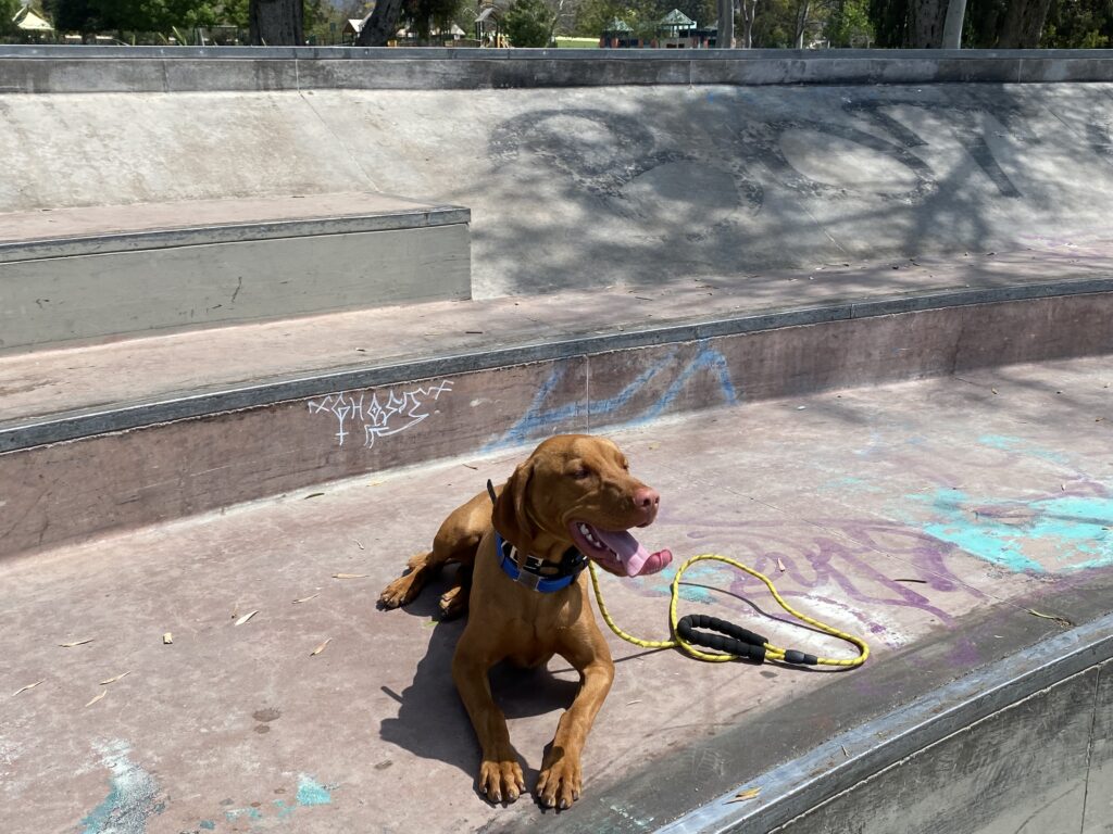 Training Summary: Today we took training to the skatepark. Rusty is terrified of skateboards and bikes. We will continue to build up his confidence in environments like these. He acts skittish when he hears skateboards nearby. He has improved so much on his heel command. He walks on my left side and is tugging less on the leash.
