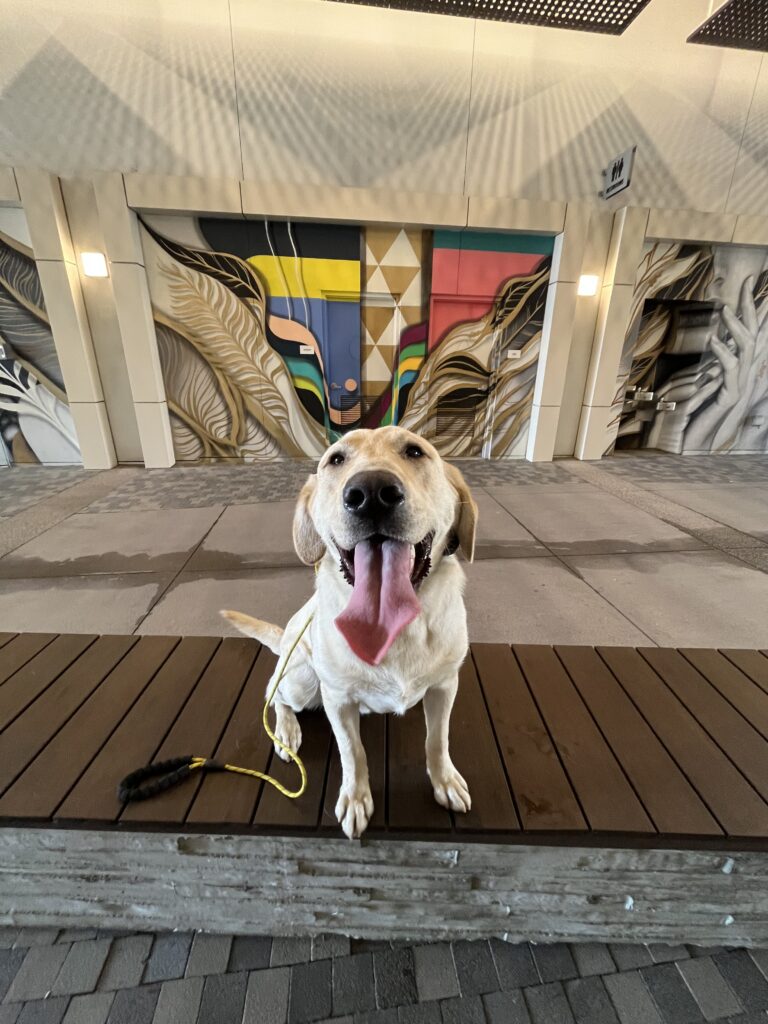 Training Summary: We continue to expose Scooby to new environments daily! He loves to be around people! I put him on command in high distracted areas like this so he can focus on his task at hand, rather than the billions of distractions around him. If on command for a while, he will challenge you by breaking command…stay calm and follow through with the same command.