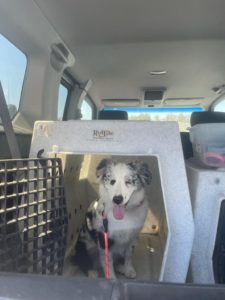 Miss Stella loves to travel in her crate. Notice how she holds command whether the door is open or not. She loves her crate at home and knows that it’s time to rest and when we get in the car she knows it’s time to have fun and work ! Great work at the outdoor plaza today Stella!