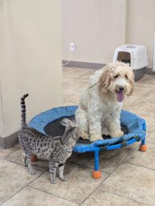 TRAINING HIGHLIGHTS: Today while Ursula was holding the place command, we introduced her to the cat, Nickel. Ursula did well staying in position while being exposed to a new and exciting distraction. This was great practice for her impulse control and neutrality around other animals. We will continue building her confidence and reliability with these types of real-world distractions.